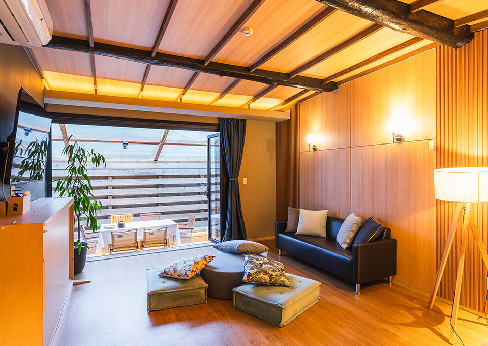BBQ専用デッキと露天風呂付、家族や愛犬と一緒に満喫できる離れヴィラ5室。丹沢の大自然の中、伝統的な温泉宿スタイルから解放された自由な愉しさと贅沢なひと時を。